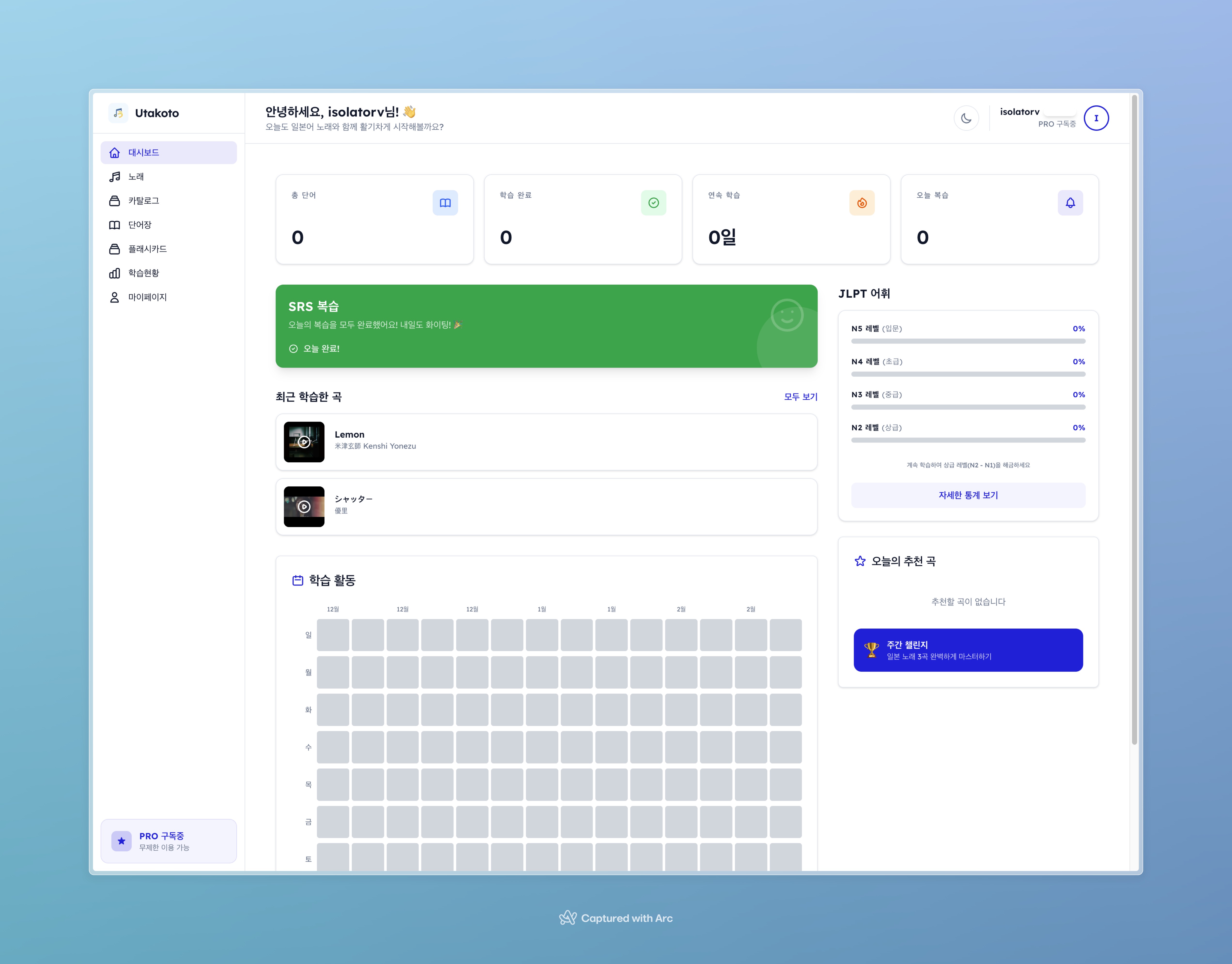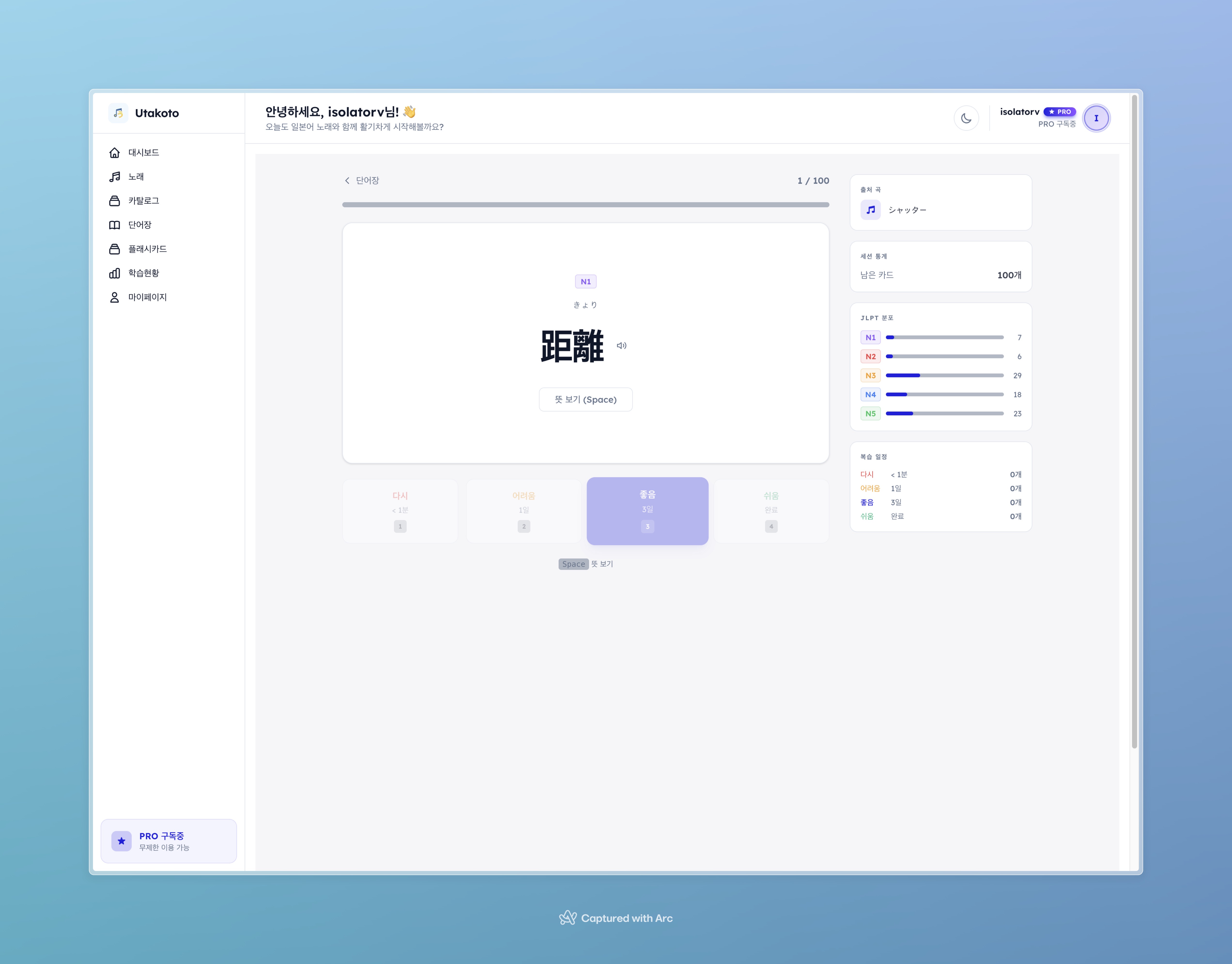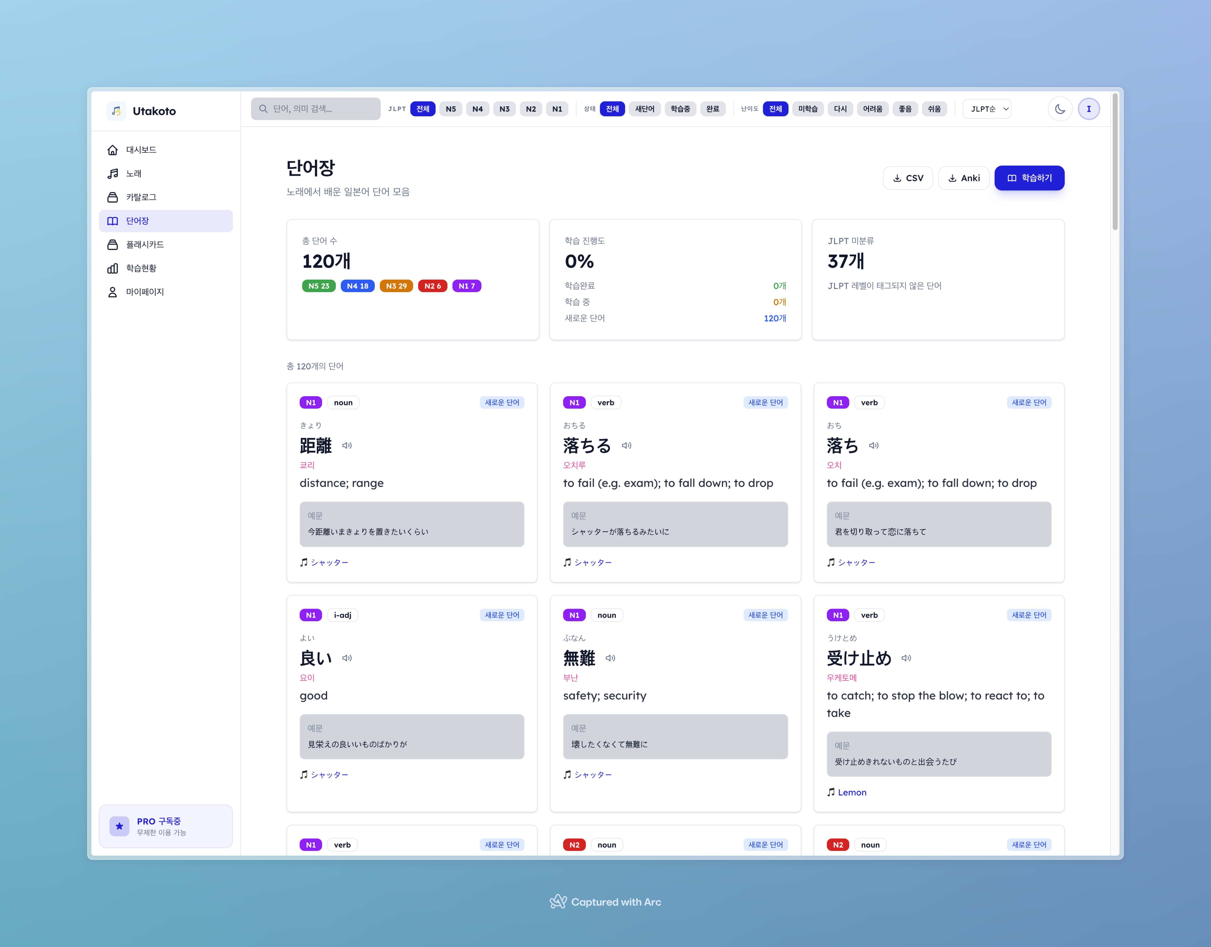 J-pop 가사가 궁금한 분 — YouTube URL만 붙여넣으면 가사, 후리가나, 한국어 번역, 발음까지 자동으로 나옵니다 Anki에 일본어 단어 카드 만들기 귀찮은 분 — 노래에서 단어를 자동 추출하고 JLPT N1~N5로 분류해줍니다. Pro 플랜이면 CSV/Anki로 내보내기도 가능합니다 일본어 복습을 까먹는 분 — SuperMemo-2 알고리즘이 최적의 복습 타이밍을 알려줍니다