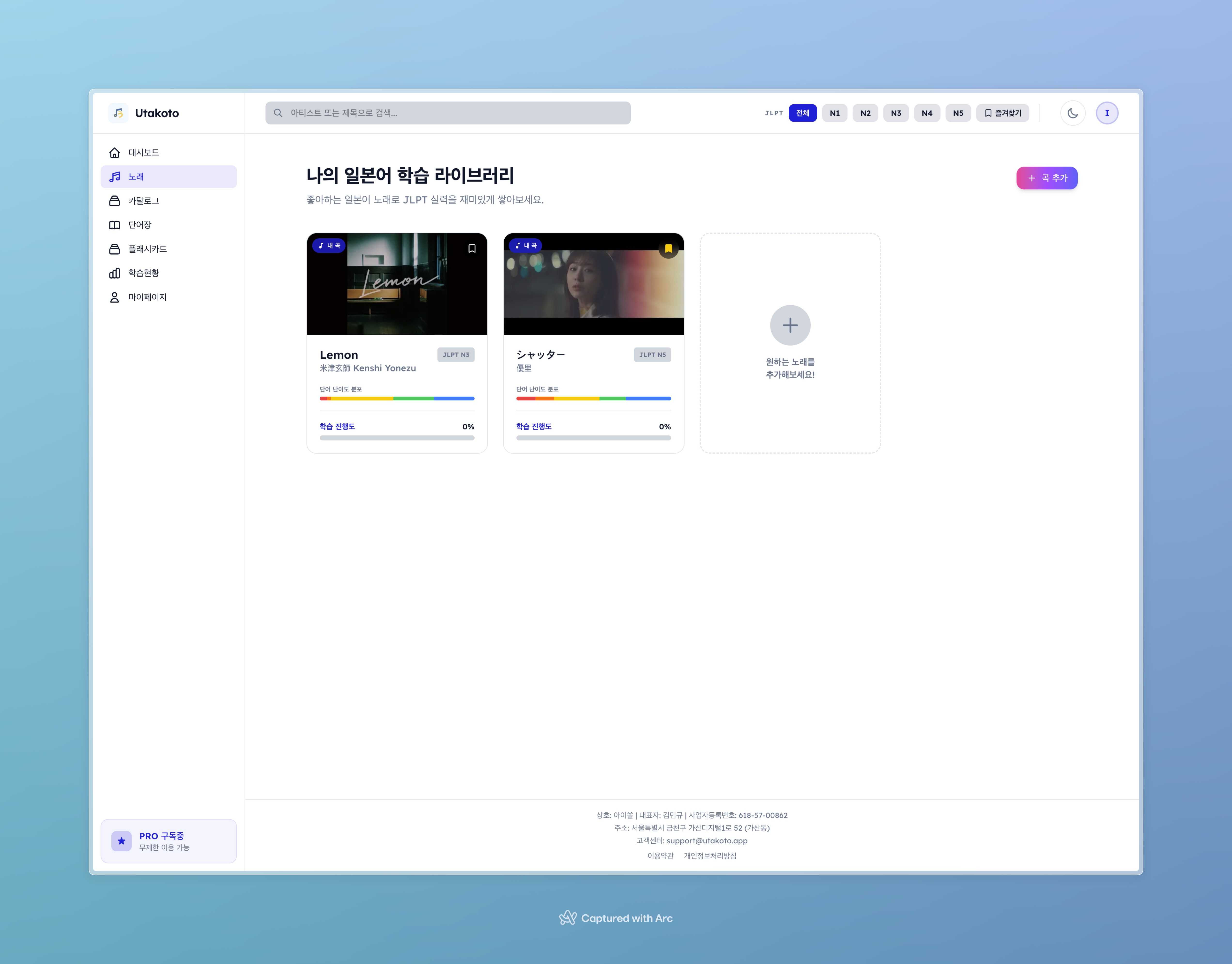 Utakoto 곡 라이브러리. 각 곡의 처리 상태, JLPT 단어 분포, 학습 진행률이 한눈에 보인다.