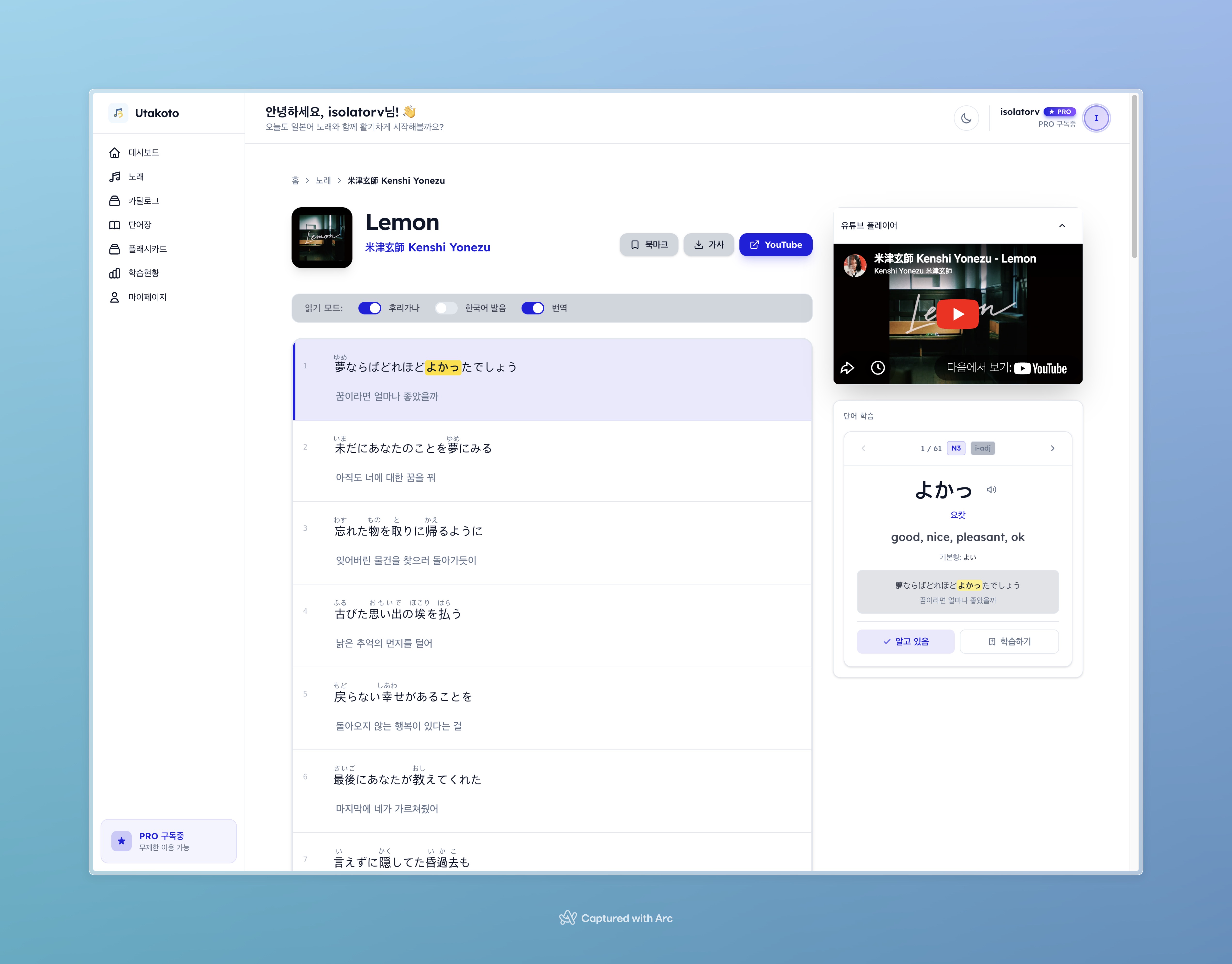 J-pop을 좋아합니다. 요네즈 켄시나 YOASOBI 노래를 들으면서 "이 가사가 무슨 뜻이지?" 하고 검색하는 일이 잦았는데요. Genius에서 가사를 찾고, 단어를 하나하나 사전에서 검색하고, Anki에 수동으로 카드를 만드는 과정이... 솔직히 너무 번거로웠습니다.