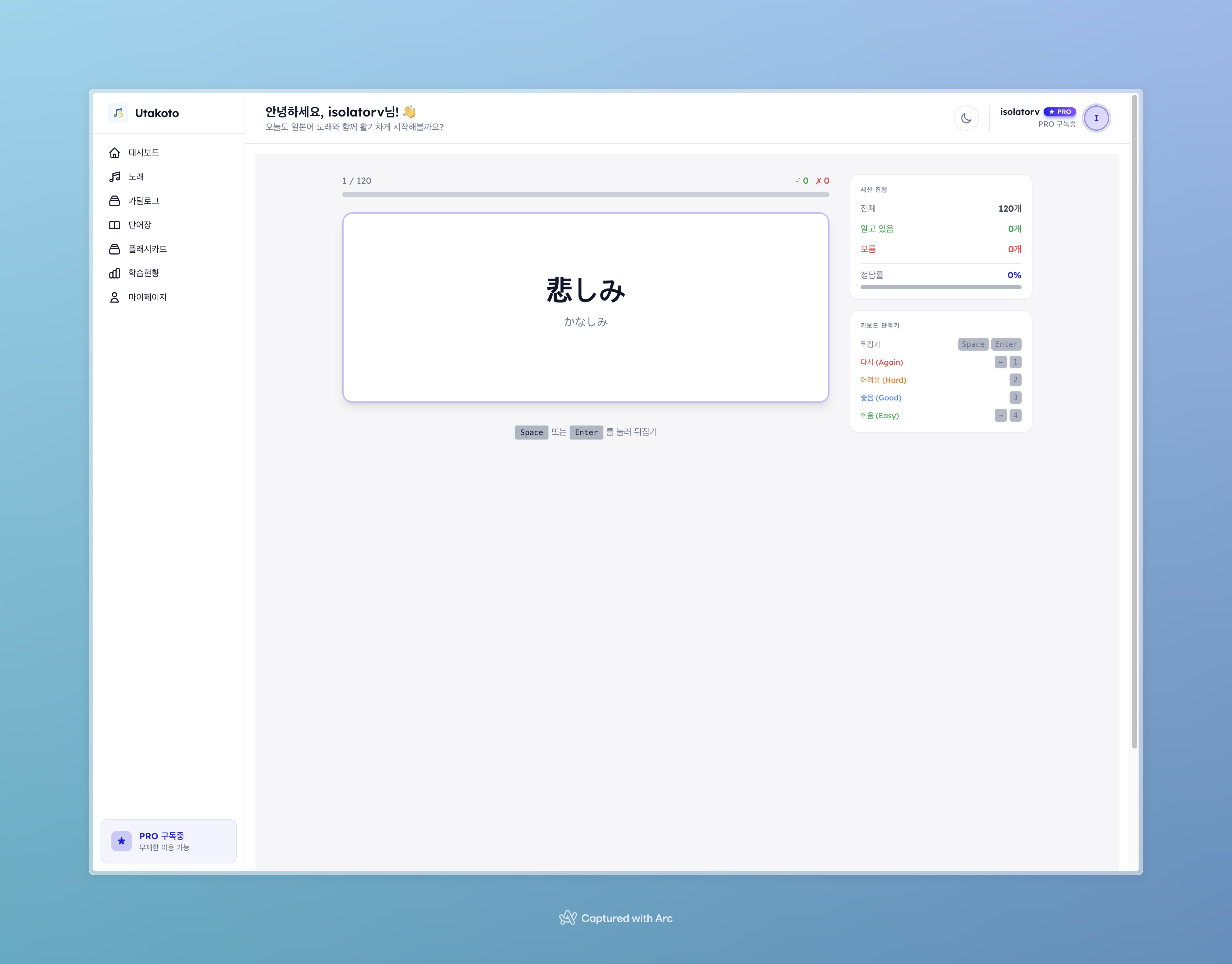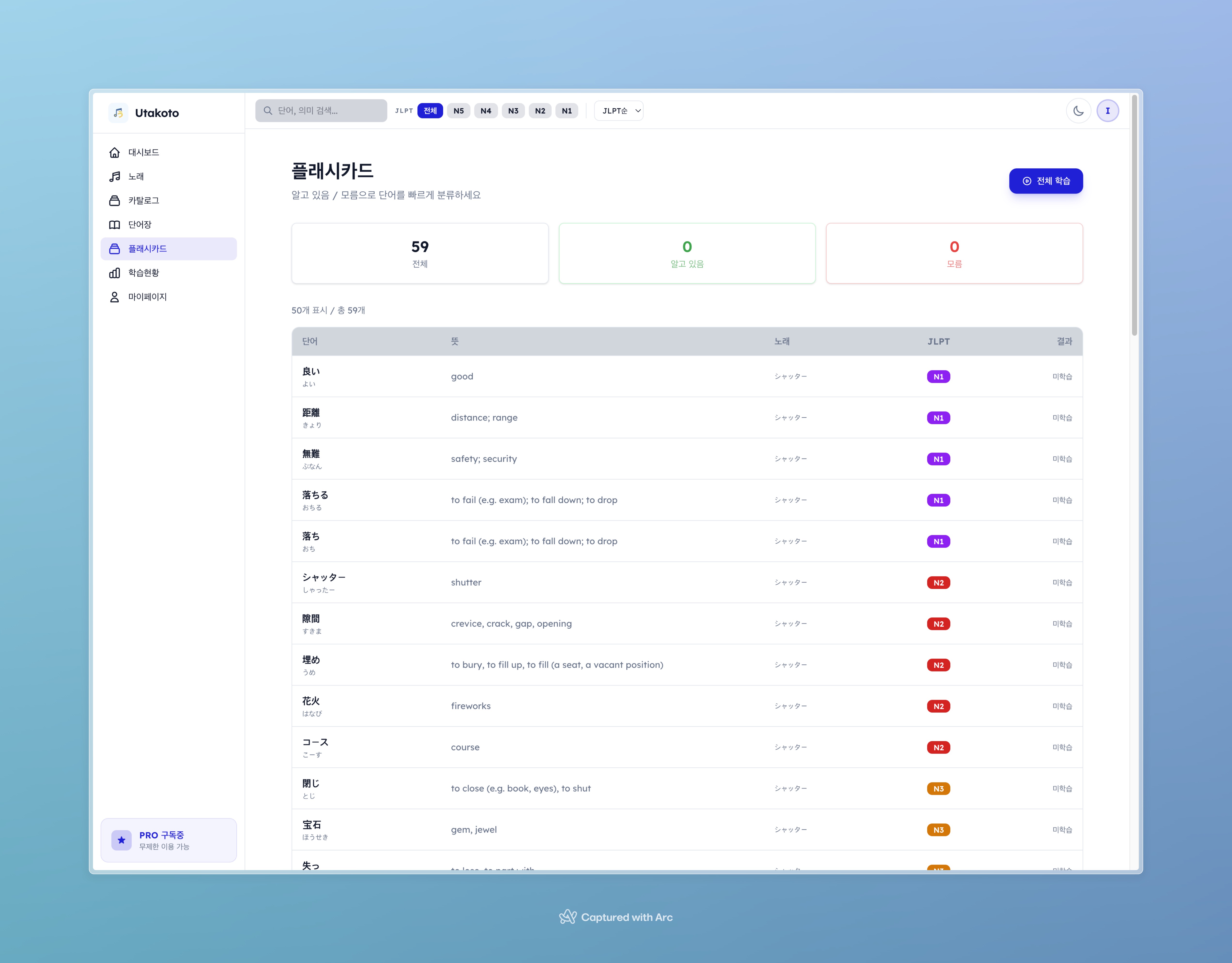 utakoto.space에 접속 (회원가입 없이 1곡 체험 가능) 좋아하는 일본 노래의 YouTube URL을 붙여넣기 30초~1분 후 가사와 단어가 자동으로 정리됩니다 플래시카드로 단어 복습 시작 무료 플랜으로도 5곡까지 등록 가능하고, SRS 플래시카드와 통계 기능은 제한 없이 사용할 수 있습니다. Pro 플랜(월 $1.99 / 연 $19.99)은 무제한 곡 등록과 데이터 내보내기(CSV/Anki)를 지원합니다.
