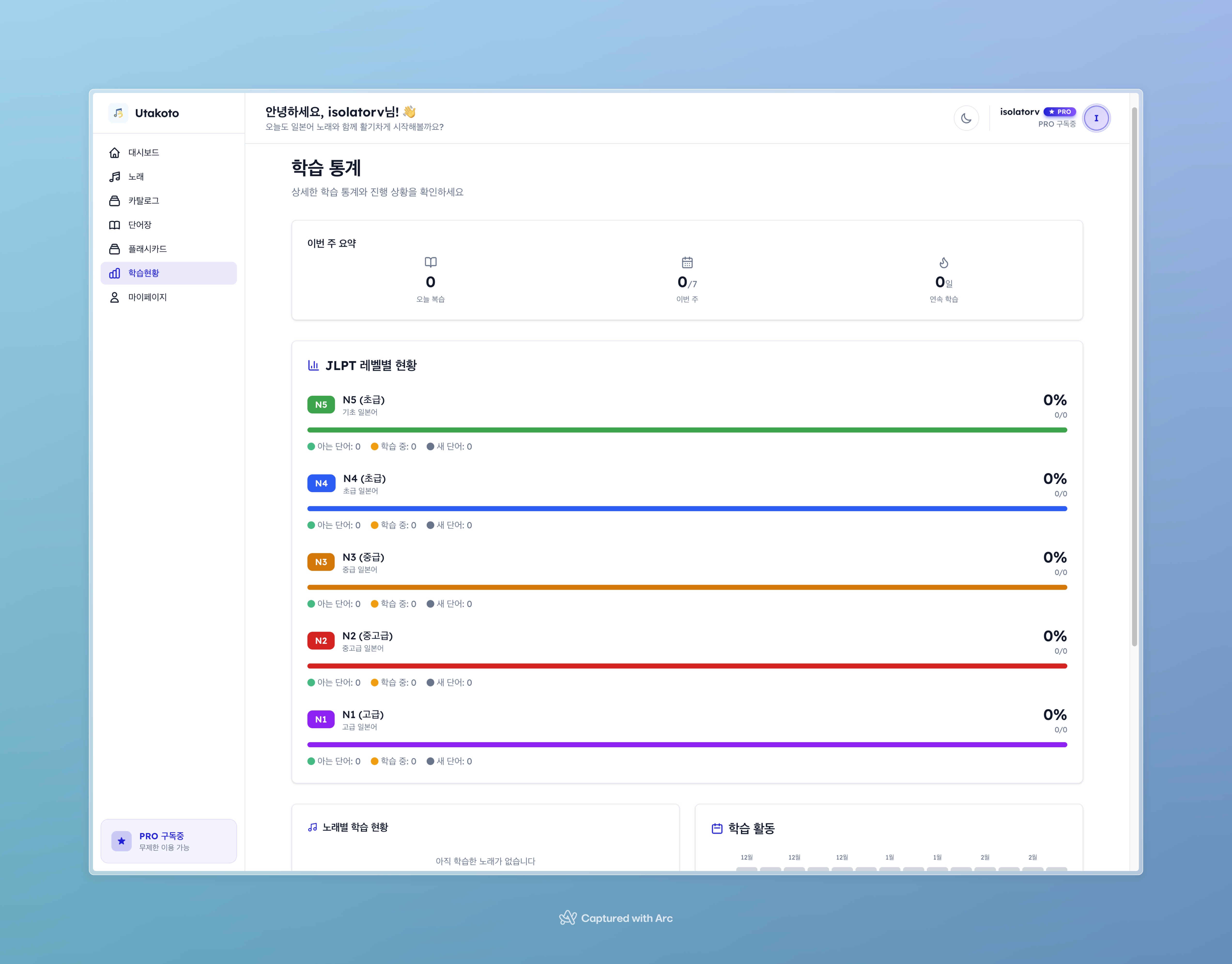 통계 페이지. JLPT 레벨별 분포 차트, 90일 복습 히트맵, 주간 요약, 곡별 학습 진행률을 시각화한다.